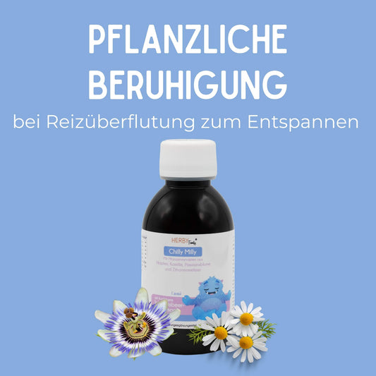 Entdecke auch unser pflanzliches Kinderprodukt bei Unruhe, Reizüberflutung und Ängstlichkeit: Chilly Milly unterstützt mit Passionsblume, Hopfen, Kamille, Magnesium und Vitamin B6 das Nervenkostüm der ganzen Familie. Ruhe und Ausgeglichenheit werden auf natürliche und sanfte Weise gefördert.