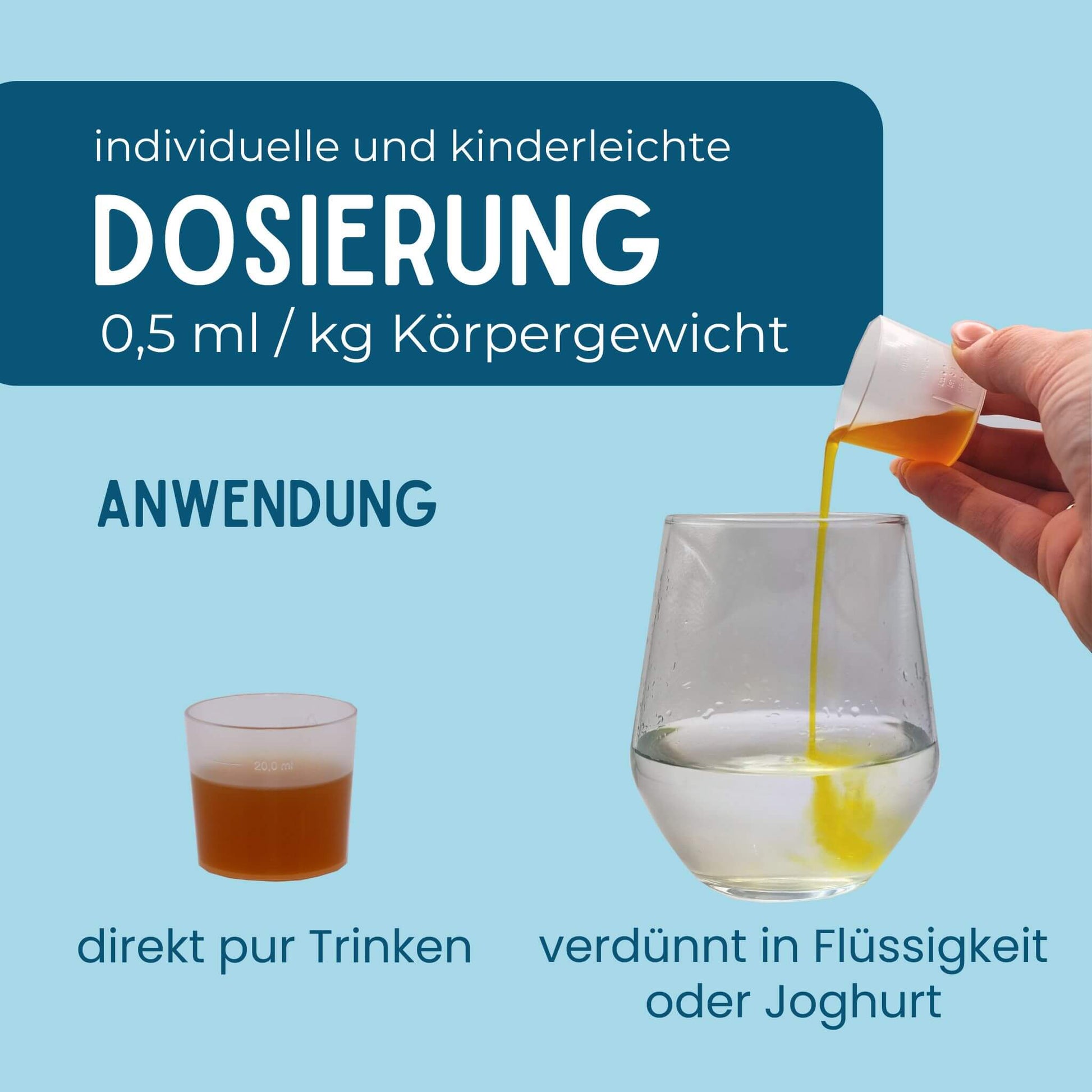 1 x täglich 0,5 ml pro kg Körpergewicht mit der Dosierkappe abmessen und trinken. Kann bei Bedarf auf auf zwei halbierte Dosen aufgeteilt werden um es einmal Morgens und Abends zu verwenden.