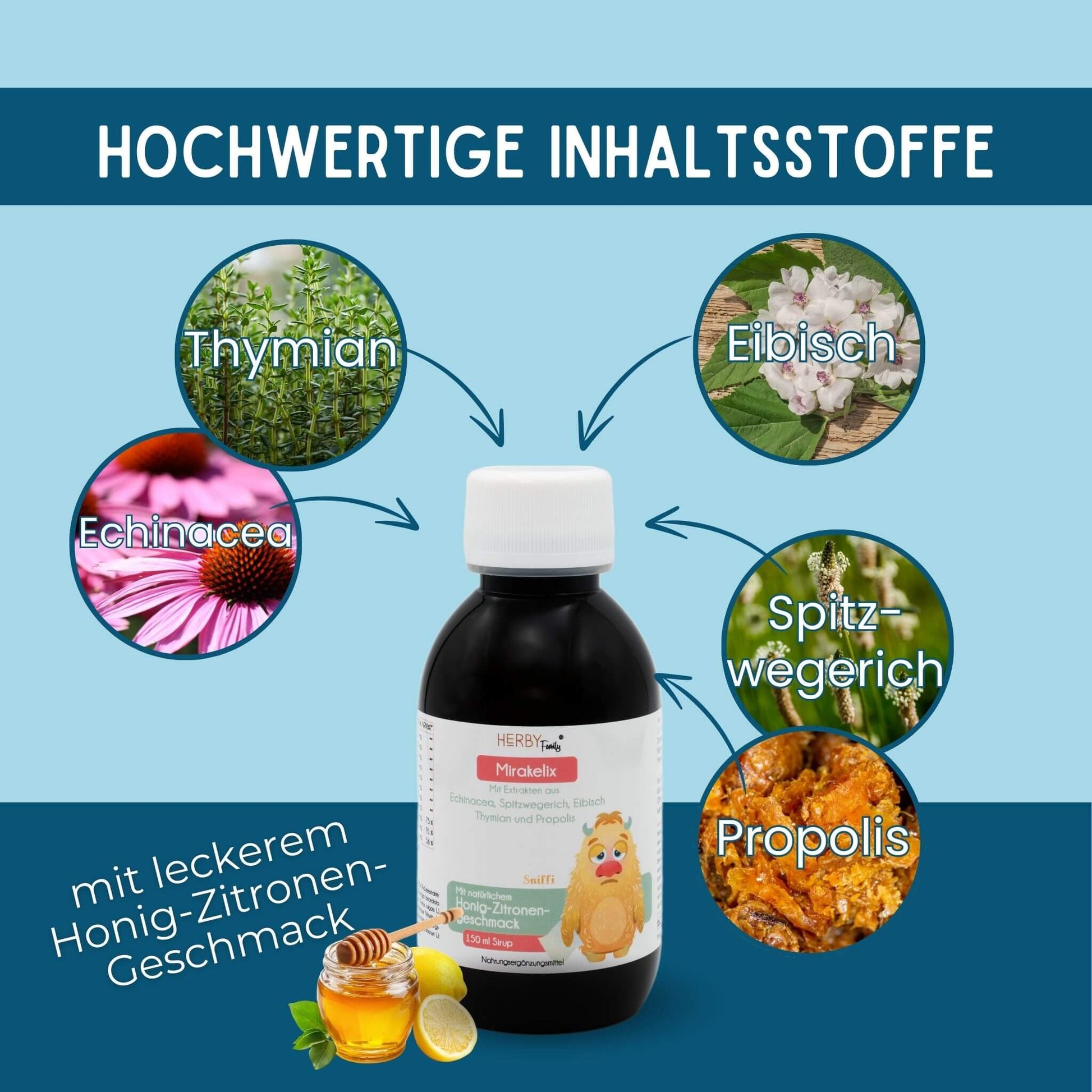 Unser Mirakelix Sirup enthält eine einzigartige Kombination aus den Pflanzenextrakten Echinacea, Spitzwegerich, Eibisch und Thymian, kombiniert mit Propolis, die auf Basis wissenschaftlicher Erkenntnisse entwickelt wurde.