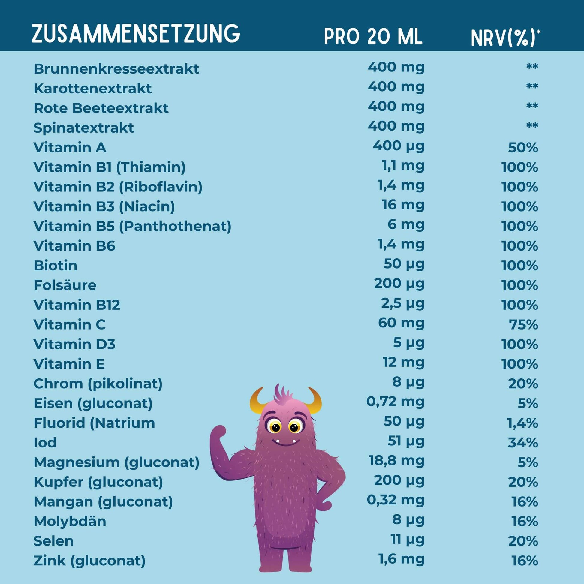 Die Kombination aus pflanzlichen Extrakten aus Roter Beete, Karotten, Spinat und Brunnenkresse sowie ausgewählten Vitaminen und Mineralstoffen unterstützt eine nährstoffbewusste Ernährung, wenn Abwechslung auf dem Teller gerade schwierig ist. Ideal für kleine Gemüsemuffel und für Zeiten, in denen der Fokus auf Balance und Routine liegt.