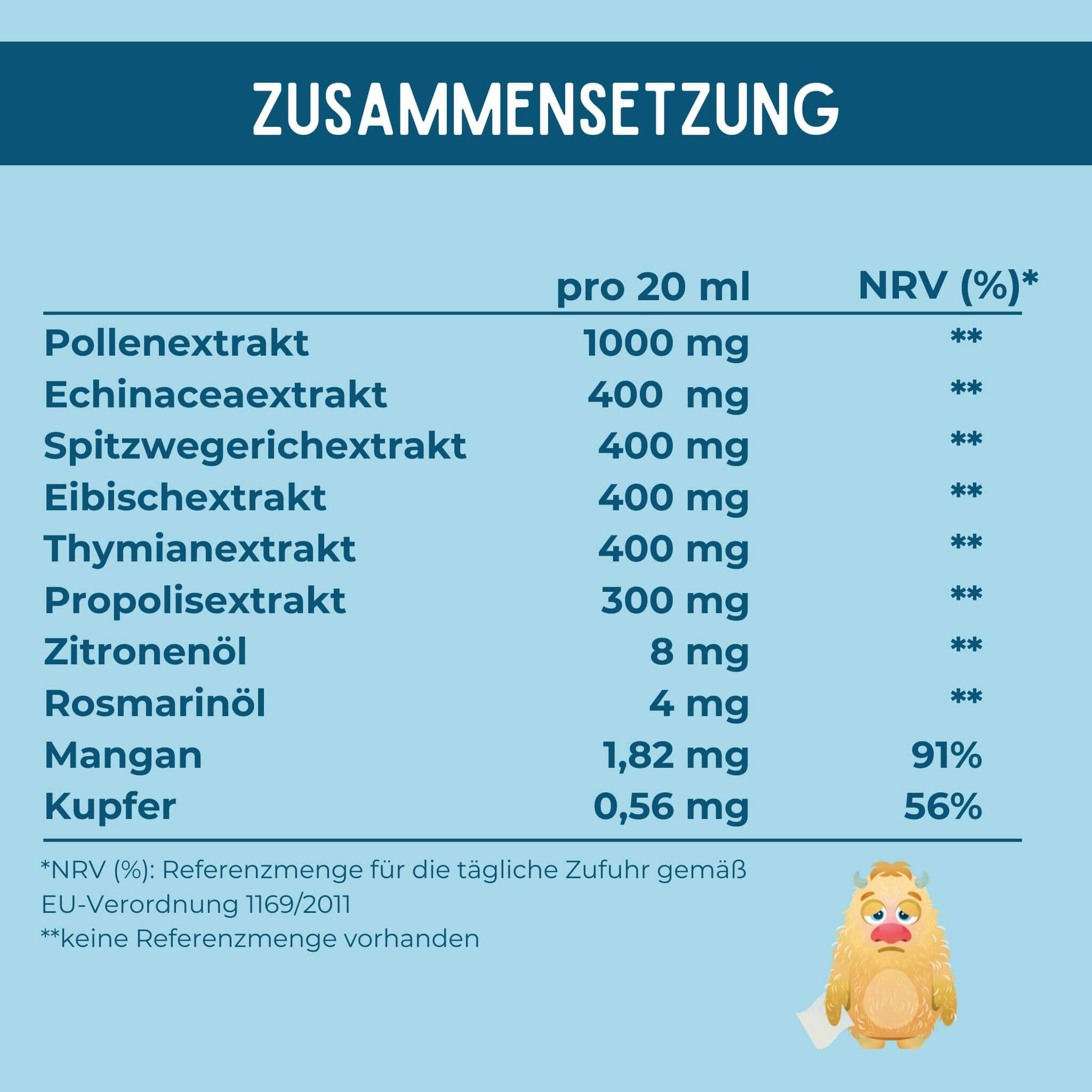Gereinigtes Wasser; Glycerin; Honig; Fruktose; Pollenextrakt (4,35%); Kräuterextrakte: Echinacea (Echinacea purpurea L.) (1,74%), Wegerich (Plantago lanceolata L.) (1,74%), Eibisch (Althaea officinalis L.) (1,74%), Thymian (Thymus vulgaris L.)(1,74%), Propolisextrakt (1,30%); Antioxidationsmittel: Ascorbinsäure; Verdickungsmittel: Xanthangummi; Konservierungsmittel: Kaliumsorbat; Säuerungsmittel: Zitronensäure; Mangangluconat; ätherisches Zitronenöl (Citrus limonum L.); Kupfergluconat; ätherisches Rosmarinöl (Rosmarinus officinalis L.).
